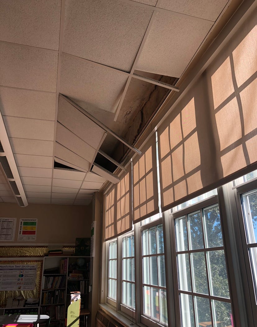 When Jeanine got on a ladder to replace a flickering lightbulb I had flashbacks to the “no fly zone” area of my classroom I had to enforce for a few months to prevent students from being knocked out by continually falling ceiling tiles (when I was looking for a photo that showed how tired I looked I found documentation of the zone:)