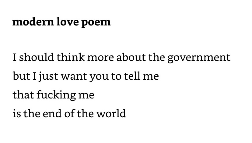 I would typically link some articles I’m into but my online reading has paused while I devour the newest Sally Rooney (did you know she’s 30?! how am I still shocked when accomplished people are my age) so instead I will link to my new fav post by Cat Cohen, as an excuse to close this with one of my fav poems from her book, “God I Feel Modern Tonight - Poems from a Gal About Town.”
